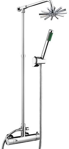Thermostatic shower set with bar shower valve, riser rail with straight shower arm, shower handset and fixed star shower head in chrome.