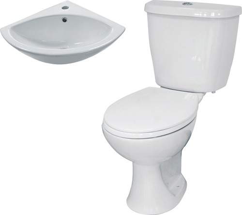 3 Piece bathroom suite with close coupled toilet, cistern, fittings, seat, 1 tap hole wall hung corner basin & basin brackets.
