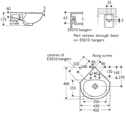 2 Tap hole corner basin. Size 450mm. Taps and waste are not included.