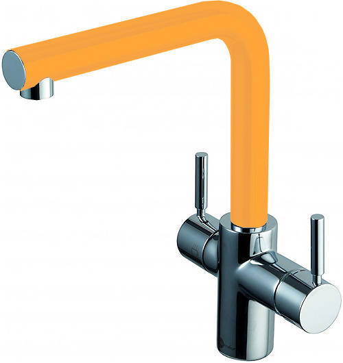 3 in 1 Instant boiling hot, regular hot and cold water filtered kitchen tap. Finished in chrome with orange spout.