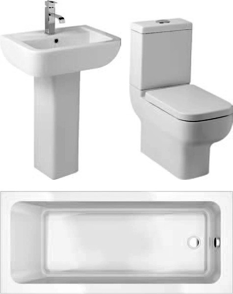 Options 600 complete bathroom suite with 1700x750mm single ended bath, toilet pan, soft close seat, cistern, basin and pedestal.