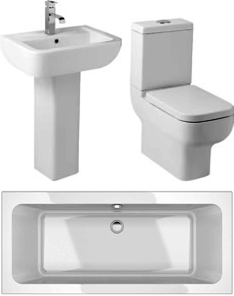 Options 600 complete bathroom suite with 1800x800mm double ended bath, toilet pan, soft close seat, cistern, basin and pedestal.