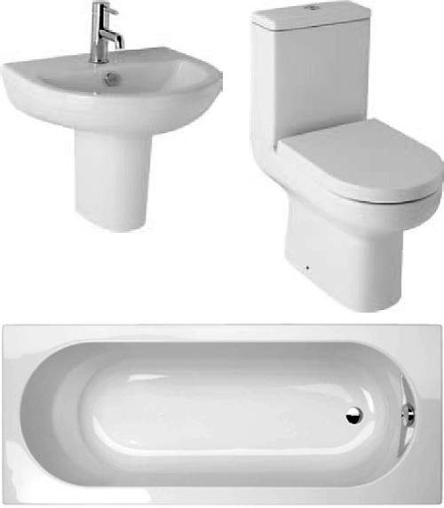 Revive deluxe bathroom suite with 1700x750mm single ended bath, toilet pan, soft close seat, cistern, basin and wall mounted semi pedestal.