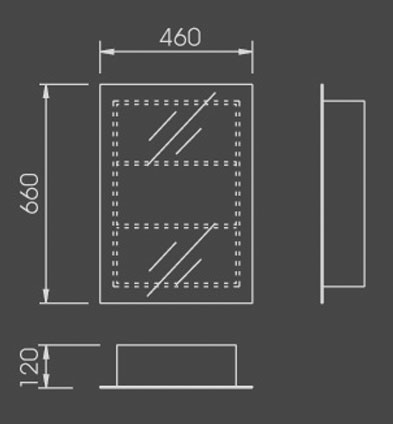 Austin stainless steel mirror bathroom cabinet with sliding door. Size 460x660x120mm. Approx 860mm wide with door open.