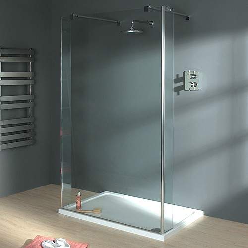 Celino frameless glass shower screen in silver with side screens and 1000mm bracing arms. For use in a wet room or with a shower tray. Size 1000x1950mm.