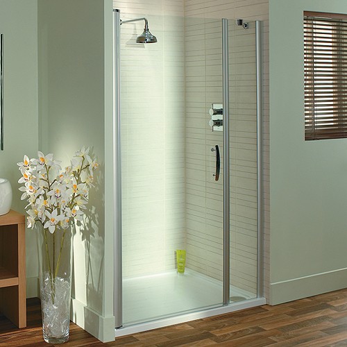 Latina semi-frameless pivot shower door in silver with in-line glass panel and bracing arm. Size 1100mm.
