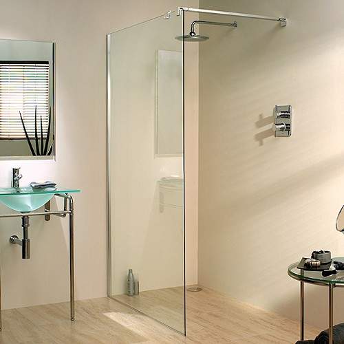 Vizzini frameless glass shower screen in silver with 800mm bracing arm. For use in a wet room or with a shower tray. Left handed. Size 1200x1950mm.