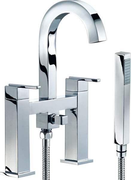 Bath shower mixer tap with high spout and shower kit in chrome.