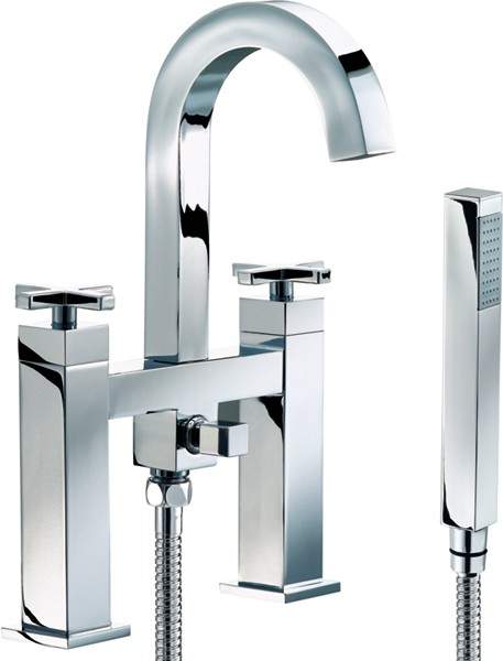 Bath shower mixer tap with high spout and shower kit in chrome.