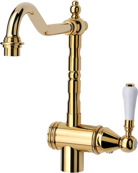 Rustique traditional kitchen mixer tap in gold with swivel spout.