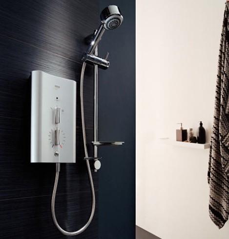 Mira Escape 9.8kW thermostatic in satin chrome.