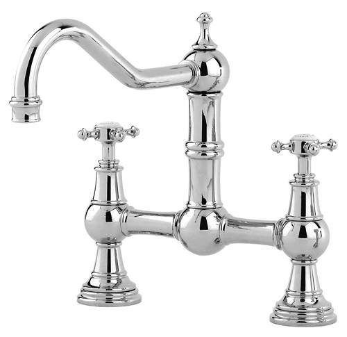 Perrin & Rowe Provence 2 hole bridge kitchen tap in chrome with crosshead handles.