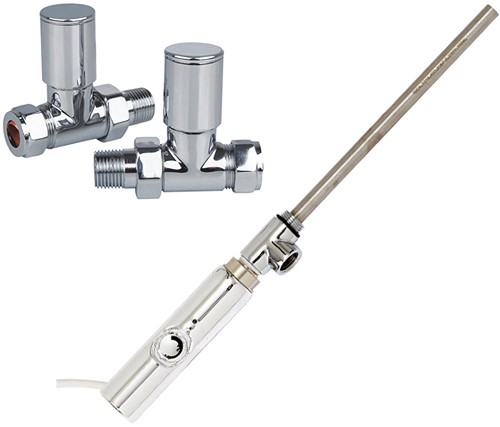 Thermostatic heating element pack for towel radiator in chrome with modern straight valves. 150 Watts.