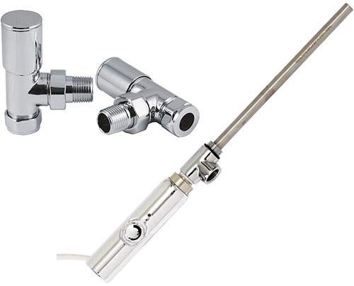Thermostatic heating element pack for towel radiator in chrome with modern angled valves. 300 Watts.