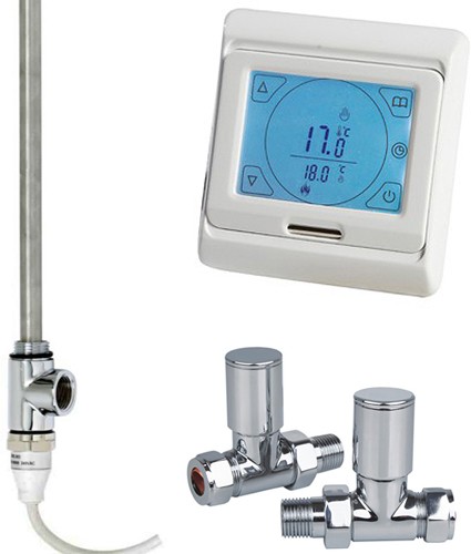 Digital touch screen thermostat with 600w radiator element and modern straight valves.