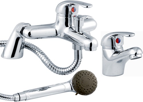 Basin mixer and bath shower mixer tap set in chrome with free shower kit.
