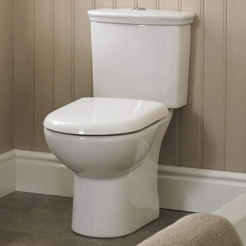 Barmby toilet with dual push flush cistern, fittings and seat. Size 400W x 690D x 750H mm.