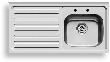 Sit on kitchen sink with roll front, left hand drainer, two tap holes and sink waste. Size 1000 x 500 mm. Stainless steel.
