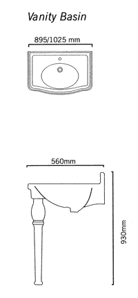 Basin with ceramic legs. Size 1025 x 560mm. This basin is suitable for 1 tap hole and 3 tap hole Installations. Bottle trap is not included.
