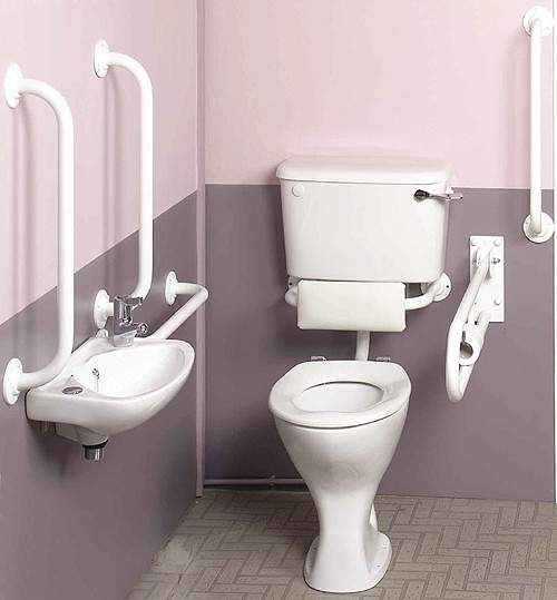 Low level wc pack with white grab rails.