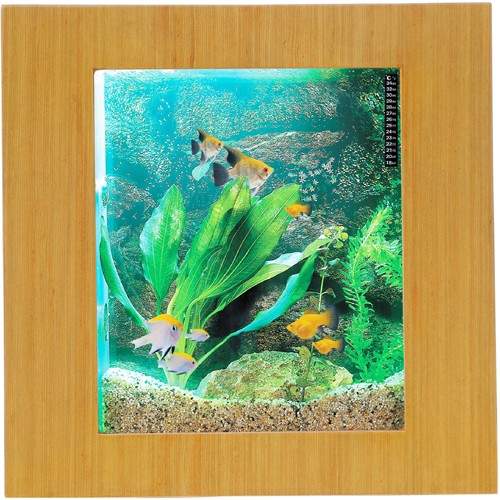 Wall hung aquarium with oak frame. Comes with a unique filtration system to keep the water clean for around a year.