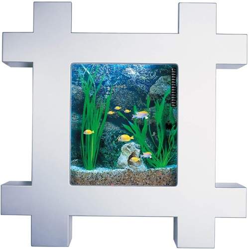 Wall hung aquarium with silver frame. Comes with a unique filtration system to keep the water clean for around a year.
