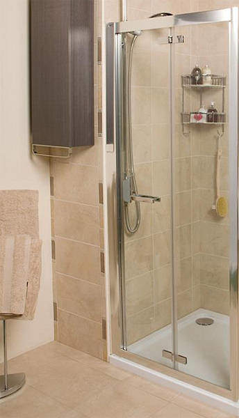 Embrace 800mm bi-fold shower door in silver with 6mm thick glass.