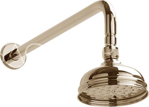 Chelsea traditional 130mm shower head in gold with wall mounting arm.