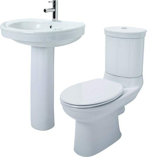 4 Piece bathroom suite with toilet, cistern, fittings, seat, 1 tap hole basin and pedestal.