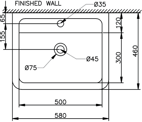 Free standing basin with 1 tap hole. Size 580W x 460D mm. Tap and waste not included.