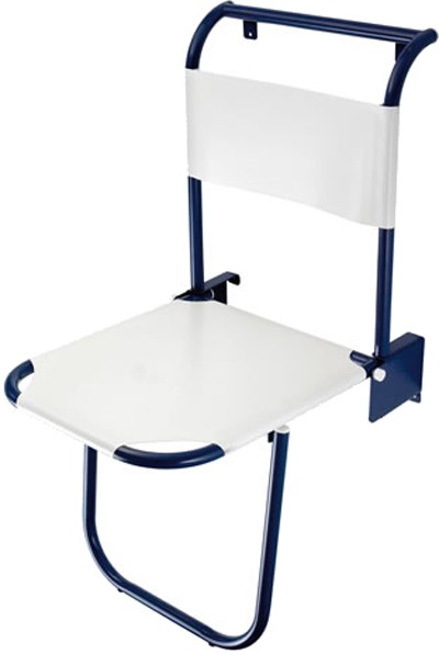 Wall mounted seat with blue frame.