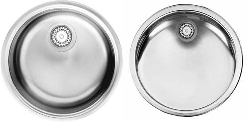 Round bowl inset kitchen sink in stainless steel with round drainer.