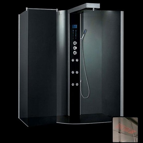 Walk in shower enclosure with shower valve, handset, rain shower and body jets Size 1500x900mm. Suitable for wetrooms. Left handed.