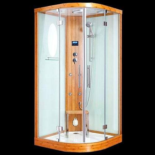 Quadrant steam shower cubicle in bamboo finish, 8mm safety glass. steam generator, chromatherapy lighting, seat, body jets and shower tray. Size 1000x1000mm. The ideal replacement for existing shower enclosures.