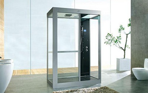 Rectangular steam shower enclosure with mirror ceiling (safety glass), marble foot plate, 8mm thick glass, clear glass back panel, shower tray. Size 1500x900mm.