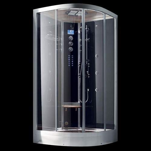 Quadrant steam shower enclosure in aluminium with 8mm thick glass, black glass back panel, shower tray, waterproof teak floor, teak ceiling and folding seat. Size 1000x1000mm.