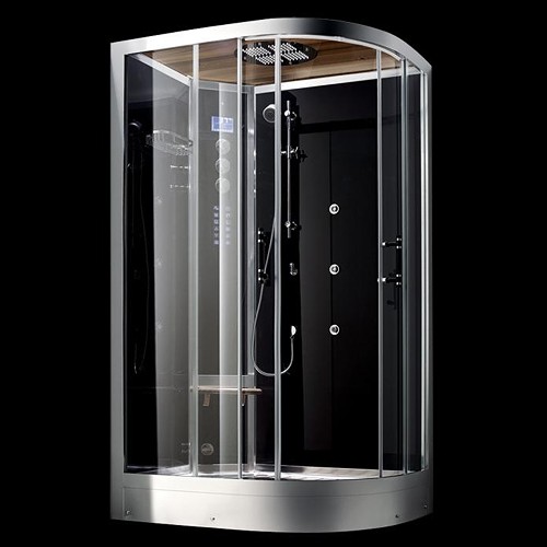 Offset quadrant, steam shower enclosure in aluminium with 8mm thick glass, black glass back panel, shower tray, waterproof teak floor, ceiling and folding teak seat. Left handed. Size 1200x900mm.