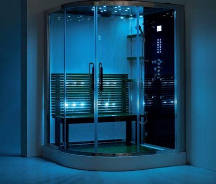 Corner steam shower enclosure in aluminium with 8mm thick glass, black and white glass back panel, waterproof oak floor, bench seat and shower tray. Size 1500x1500mm.