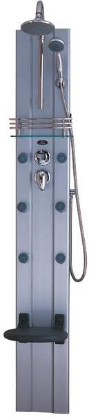 Ontario aluminium bathroom shower panel with 6 body jets, fixed shower head, hand shower and integral shower seat.