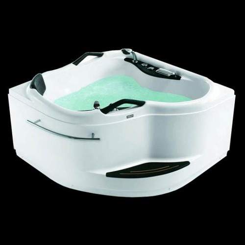 Corner whirlpool bath with bath panel and head rest. Size 1380x1380mm.