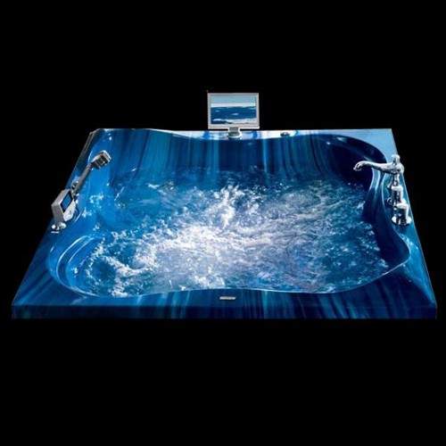 Large square sunken whirlpool bath with TV and digital controls in marble blue. Size 1500x1500mm.