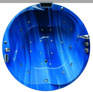 Large round sunken whirlpool bath with TV and digital controls in marble blue. Size 1600x1600mm.
