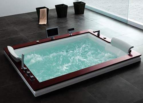 Large sunken whirlpool bath with TV and oak surround. Size 1850x1500mm.