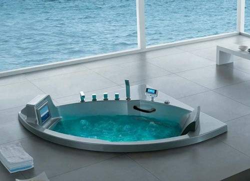 Corner sunken whirlpool bath with TV and digital controls. Size 1470x1470mm.