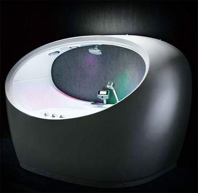 Designer back to wall whirlpool bath with digital controls and rain shower. Size 1900x980mm.