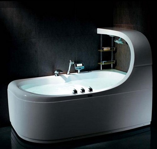 Designer corner whirlpool bath with digital controls and rain shower. Size 1900x980mm.
