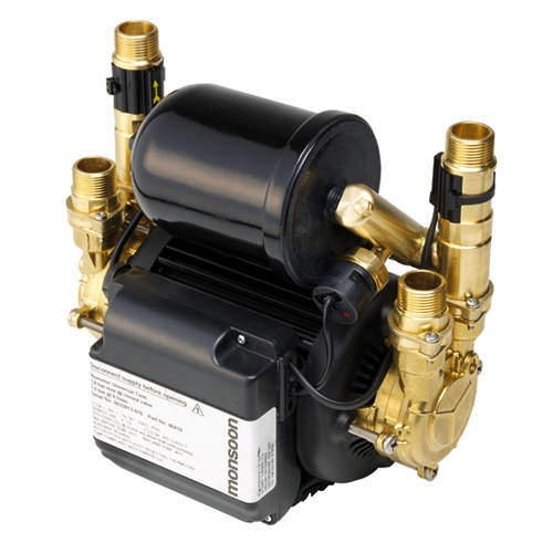 Monsoon universal twin flow pump for use with positive or negative head systems. Includes flexible hoses. Boosts water pressure to 4.5 bar.