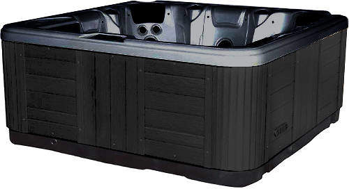 Hydra 6 person Hot Tub in midnight opal with black cabinet and light yellow cover. Size: 2000x2000x850mm.