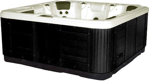 Hydra 6 person Hot Tub in white pearlescent with black cabinet and brown cover. Size: 2000x2000x850mm.