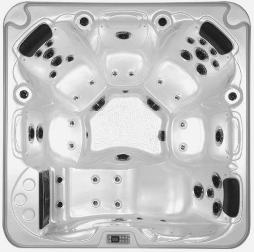 Hydra 6 person Hot Tub in silver white marble with light yellow cabinet and brown cover. Size: 2000x2000x850mm.